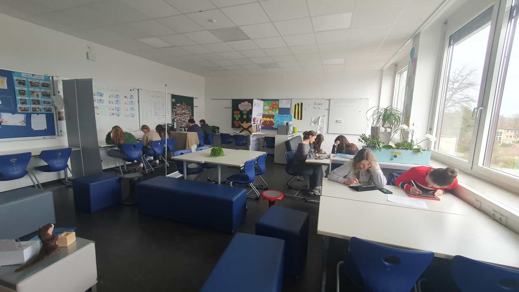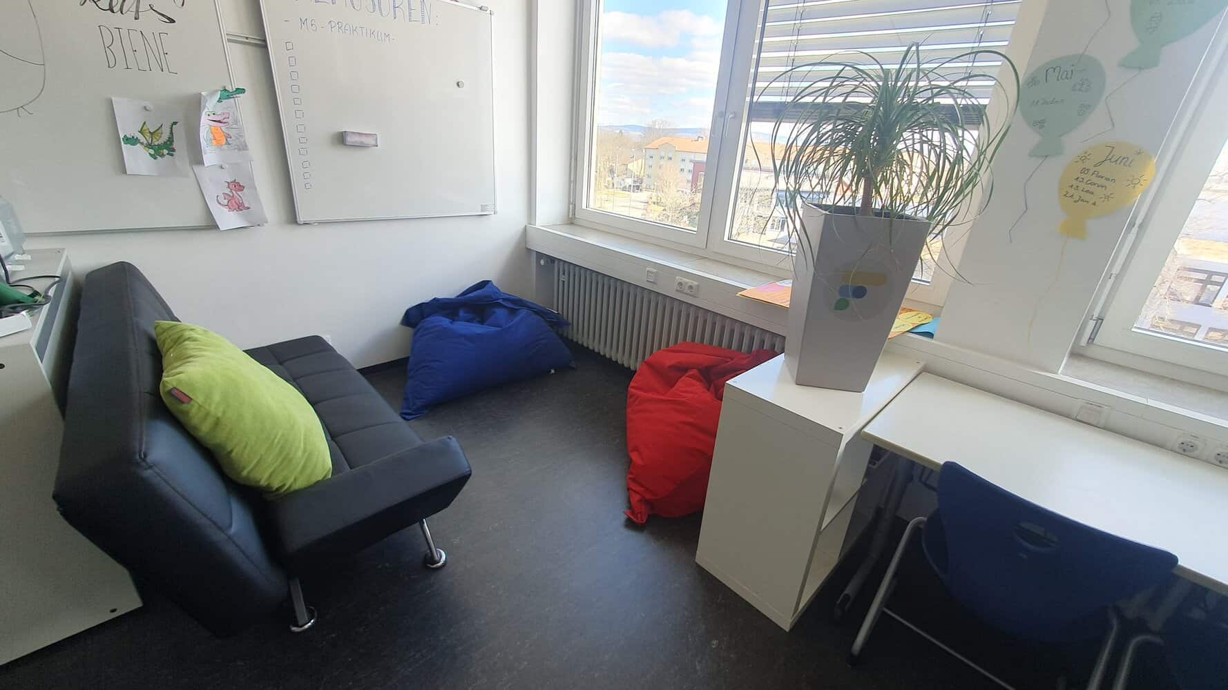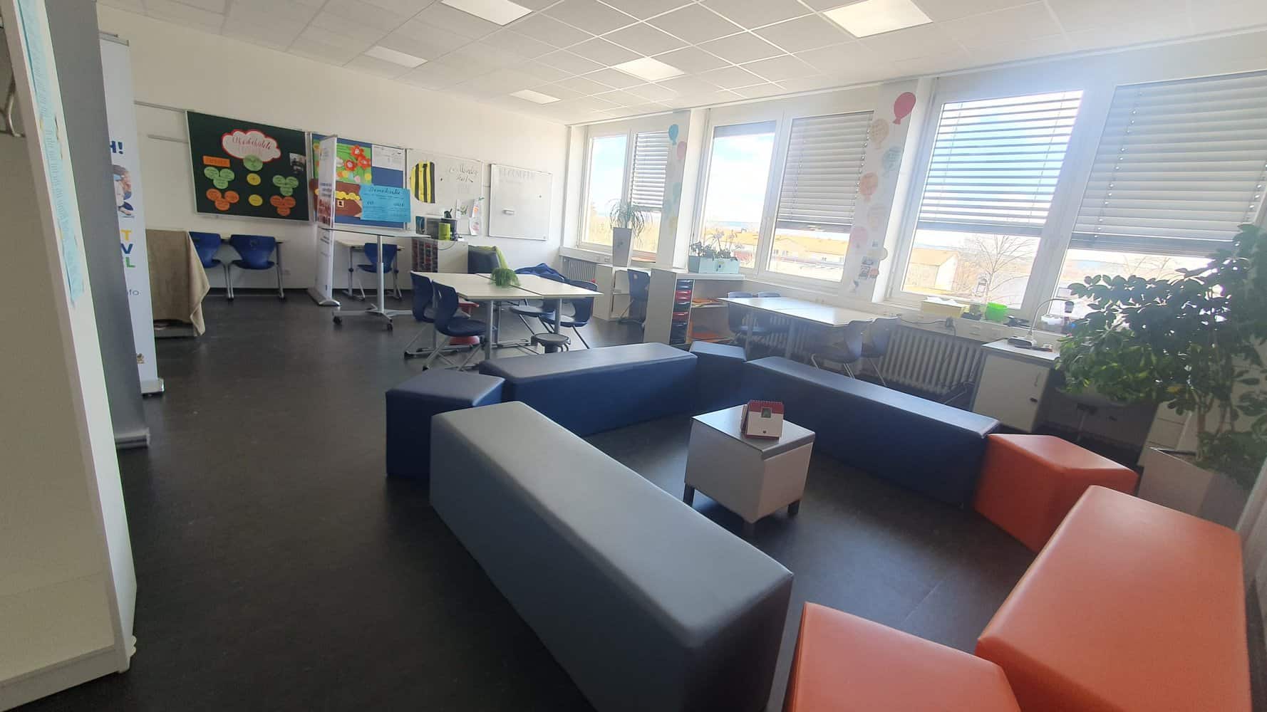 Gruppentische für Kokonstruktion, ein zentraler Beratungstisch, eine Entspannungsecke mit Sofa und Sitzsäcken sowie Raumteiler und Pflanzen sorgten für eine geöffnete, lernförderliche Umgebung. Die Rückmeldungen waren eindeutig: Mehr Wohlbefinden, intensivere Kooperation, kreative Lernprozesse und ein engerer Kontakt zu den Dozierenden wurden besonders geschätzt.
